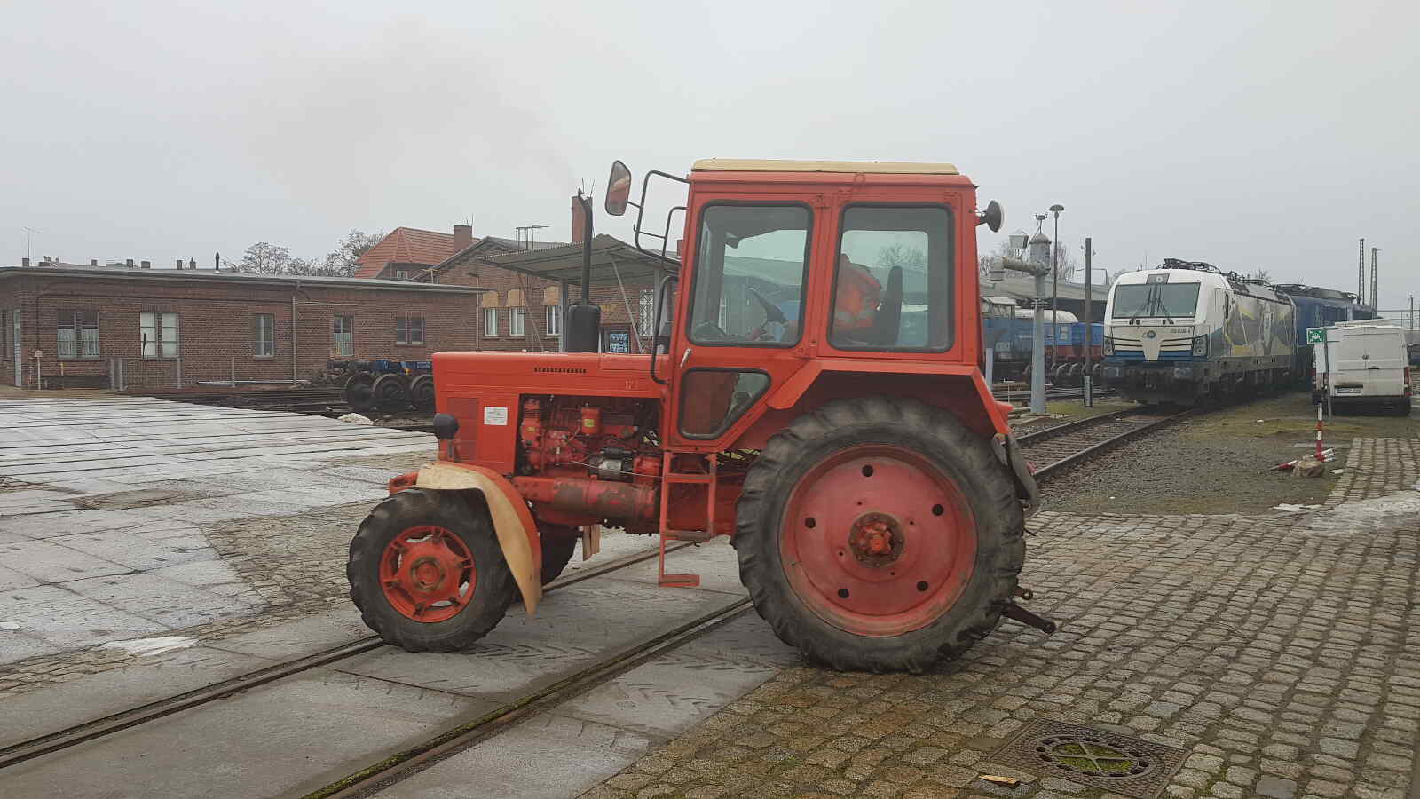 The necessary manoeuvring work for this was carried out by a Soviet-made Mts 572 tractor. It was manufactured in Minsk in 1990 and its engine has an output of approx. 60 hp. A colleague kindly stationed it in Wittenberge for our internal transport needs.