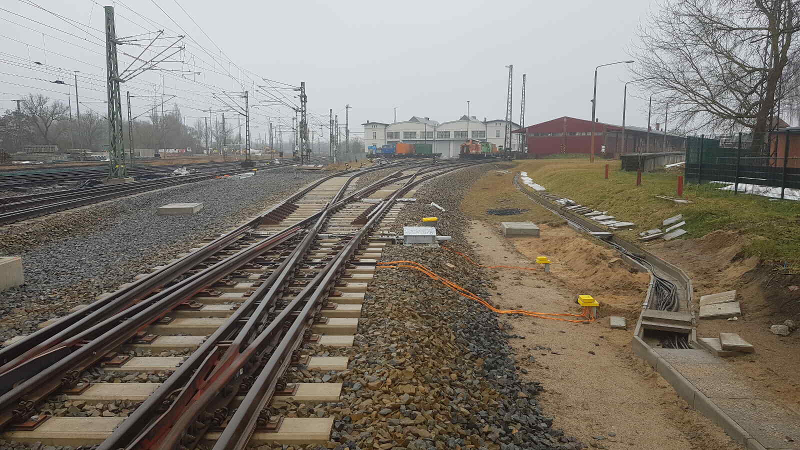 Finally, let's take a look at the new eastern connection to the Wittenberge industrial and harbour railway. Here, an additional freight track and a switch connection to the main line tracks to and from Berlin have been created. Among other things, this significantly simplifies the handling of container trains formed at Wittenberg harbour. Work is still ongoing here on the electrical connections for the switches and signals and the installation of the overhead line.